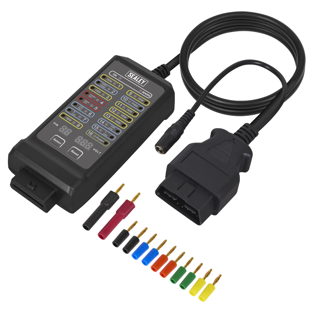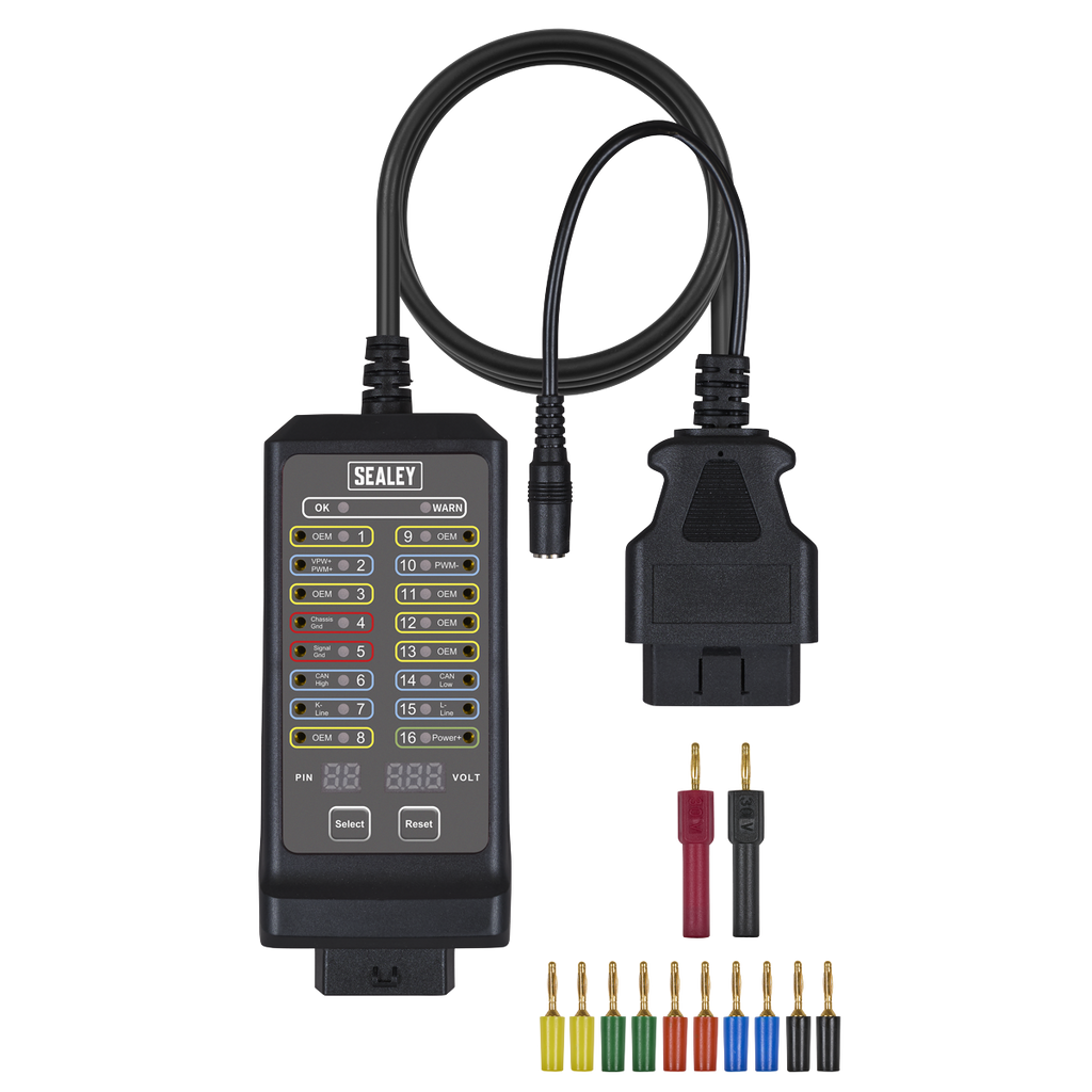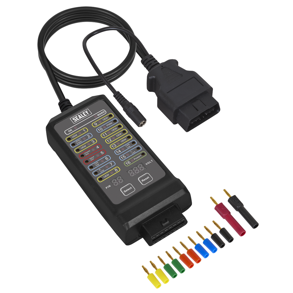 Test the onboard diagnostics port for any faults before connecting other diagnostic devices to the DLC. The breakout box is designed to be connected in series with 16-pin OBDII/EOBDII diagnostic equipment. It can also be connected to multimeters and oscilloscopes. Compatible with 12 and 24V systems. The selectable pin voltage indicator shows the real-time voltage of the selected pin. Communication Protocol Indicator - Pin 6 = CAN H, Pin 14 = CAN L, Pin 2 = VPW+, PWM+, Pin 10 = PWM-, Pin 7 = K_LINE and Pin 15 = L_LINE. Overload protection protects any connected diagnostic equipment from damage.