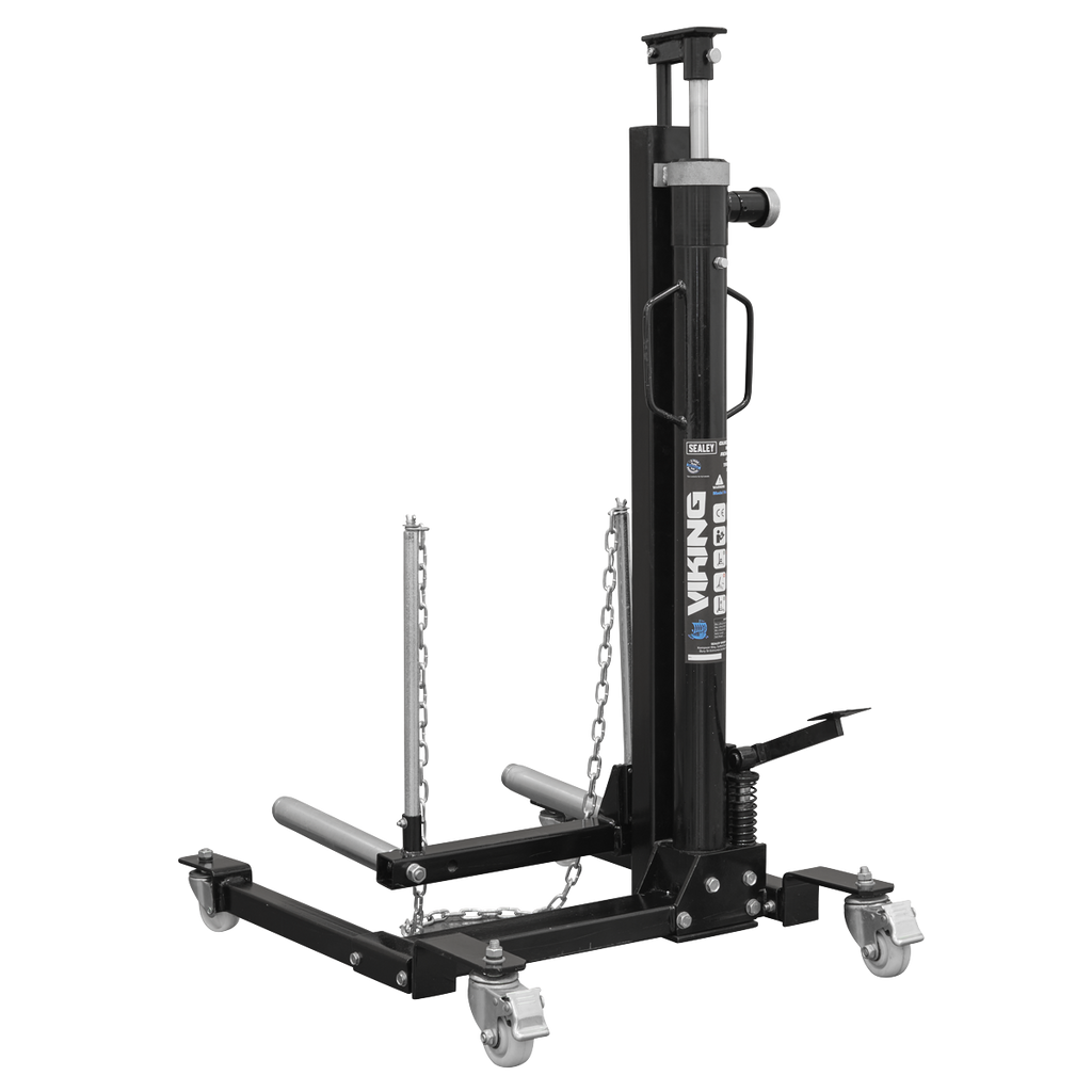 Hydraulic mechanism reaches height up to 925mm. 2-Speed hydraulic unit reduces the time and effort needed to raise arms to contact point. Solid steel construction, with friction mounted roller arms. Front and rear castors for easy manoeuvrability. For use on multiple types of wheel, with 280-340mm between rollers. Supplied with safety bar to prevent wheel from tipping forward.